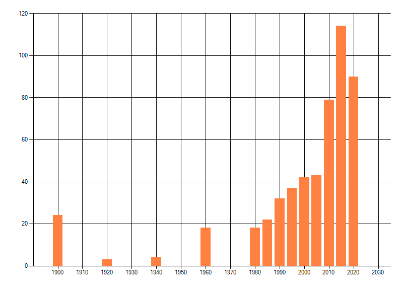 Het aantal atlasblokken (5x5 km) waarin de soort is gemeld binnen een periode van vijf jaar (vanaf 1980) of twintig jaar. Niet gecorrigeerd voor waarnemersinspanning en het aantal doorgegeven waarnemingen kan sterk variëren per periode, dus een trend in verspreiding kan hier niet direct uit worden afgelezen. Het opgegeven jaartal is het eerste jaar van de periode. Bron: gevalideerde waarnemingen uit de NDFF.