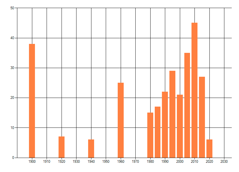 Het aantal atlasblokken (5x5 km) waarin de soort is gemeld binnen een periode van vijf jaar (vanaf 1980) of twintig jaar. Niet gecorrigeerd voor waarnemersinspanning en het aantal doorgegeven waarnemingen kan sterk variëren per periode, dus een trend in verspreiding kan hier niet direct uit worden afgelezen. Het opgegeven jaartal is het eerste jaar van de periode. Bron: gevalideerde waarnemingen uit de NDFF.