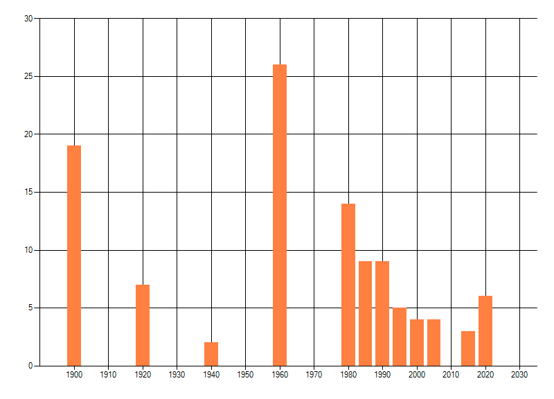 Het aantal atlasblokken (5x5 km) waarin de soort is gemeld binnen een periode van vijf jaar (vanaf 1980) of twintig jaar. Niet gecorrigeerd voor waarnemersinspanning en het aantal doorgegeven waarnemingen kan sterk variëren per periode, dus een trend in verspreiding kan hier niet direct uit worden afgelezen. Het opgegeven jaartal is het eerste jaar van de periode. Bron: gevalideerde waarnemingen uit de NDFF.