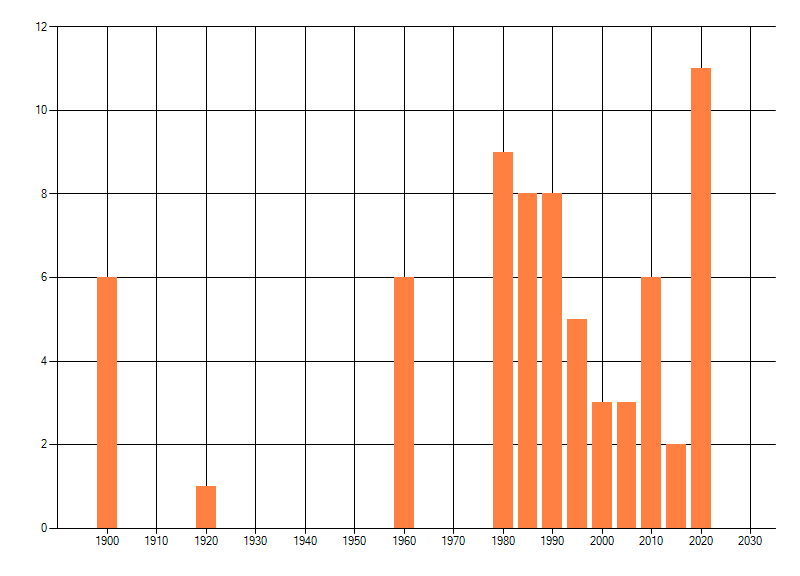 Het aantal atlasblokken (5x5 km) waarin de soort is gemeld binnen een periode van vijf jaar (vanaf 1980) of twintig jaar. Niet gecorrigeerd voor waarnemersinspanning en het aantal doorgegeven waarnemingen kan sterk variëren per periode, dus een trend in verspreiding kan hier niet direct uit worden afgelezen. Het opgegeven jaartal is het eerste jaar van de periode. Bron: gevalideerde waarnemingen uit de NDFF.