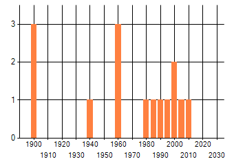 Het aantal atlasblokken (5x5 km) waarin de soort is gemeld binnen een periode van vijf jaar (vanaf 1980) of twintig jaar. Niet gecorrigeerd voor waarnemersinspanning en het aantal doorgegeven waarnemingen kan sterk variëren per periode, dus een trend in verspreiding kan hier niet direct uit worden afgelezen. Het opgegeven jaartal is het eerste jaar van de periode. Bron: gevalideerde waarnemingen uit de NDFF.