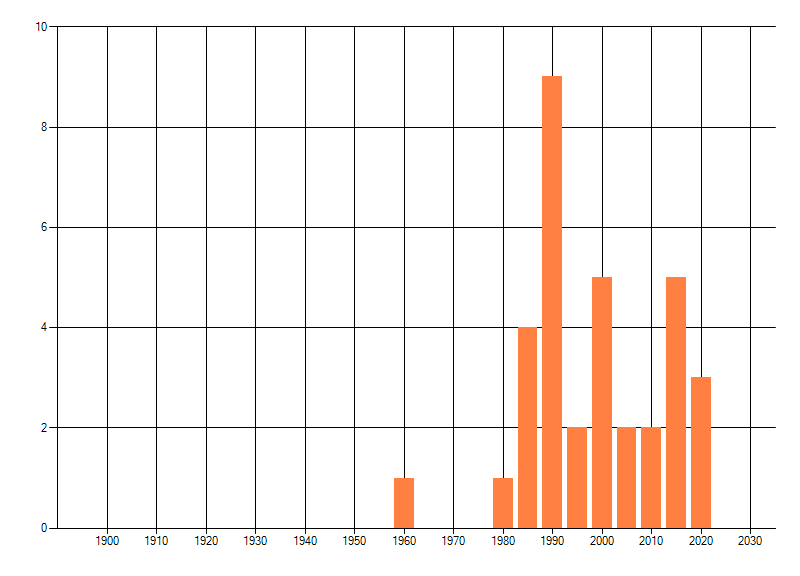 Het aantal atlasblokken (5x5 km) waarin de soort is gemeld binnen een periode van vijf jaar (vanaf 1980) of twintig jaar. Niet gecorrigeerd voor waarnemersinspanning en het aantal doorgegeven waarnemingen kan sterk variëren per periode, dus een trend in verspreiding kan hier niet direct uit worden afgelezen. Het opgegeven jaartal is het eerste jaar van de periode. Bron: gevalideerde waarnemingen uit de NDFF.