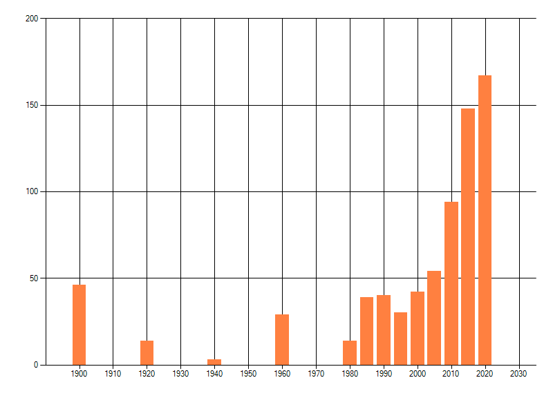 Het aantal atlasblokken (5x5 km) waarin de soort is gemeld binnen een periode van vijf jaar (vanaf 1980) of twintig jaar. Niet gecorrigeerd voor waarnemersinspanning en het aantal doorgegeven waarnemingen kan sterk variëren per periode, dus een trend in verspreiding kan hier niet direct uit worden afgelezen. Het opgegeven jaartal is het eerste jaar van de periode. Bron: gevalideerde waarnemingen uit de NDFF.