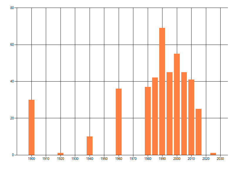 Het aantal atlasblokken (5x5 km) waarin de soort is gemeld binnen een periode van vijf jaar (vanaf 1980) of twintig jaar. Niet gecorrigeerd voor waarnemersinspanning en het aantal doorgegeven waarnemingen kan sterk variëren per periode, dus een trend in verspreiding kan hier niet direct uit worden afgelezen. Het opgegeven jaartal is het eerste jaar van de periode. Bron: gevalideerde waarnemingen uit de NDFF.
