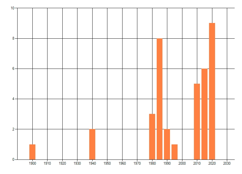 Het aantal atlasblokken (5x5 km) waarin de soort is gemeld binnen een periode van vijf jaar (vanaf 1980) of twintig jaar. Niet gecorrigeerd voor waarnemersinspanning en het aantal doorgegeven waarnemingen kan sterk variëren per periode, dus een trend in verspreiding kan hier niet direct uit worden afgelezen. Het opgegeven jaartal is het eerste jaar van de periode. Bron: gevalideerde waarnemingen uit de NDFF.