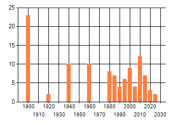 Het aantal atlasblokken (5x5 km) waarin de soort is gemeld binnen een periode van vijf jaar (vanaf 1980) of twintig jaar. Niet gecorrigeerd voor waarnemersinspanning en het aantal doorgegeven waarnemingen kan sterk variëren per periode, dus een trend in verspreiding kan hier niet direct uit worden afgelezen. Het opgegeven jaartal is het eerste jaar van de periode. Bron: gevalideerde waarnemingen uit de NDFF.