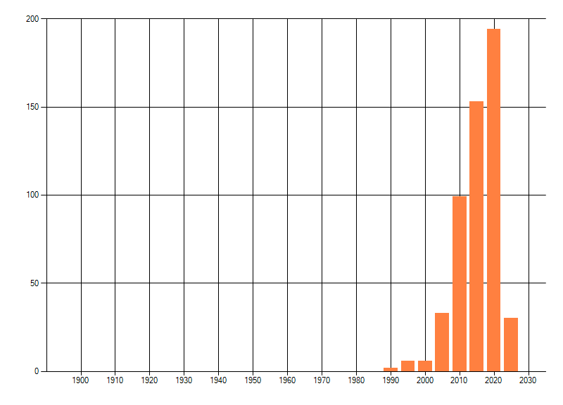 Het aantal atlasblokken (5x5 km) waarin de soort is gemeld binnen een periode van vijf jaar (vanaf 1980) of twintig jaar. Niet gecorrigeerd voor waarnemersinspanning en het aantal doorgegeven waarnemingen kan sterk variëren per periode, dus een trend in verspreiding kan hier niet direct uit worden afgelezen. Het opgegeven jaartal is het eerste jaar van de periode. Bron: gevalideerde waarnemingen uit de NDFF.