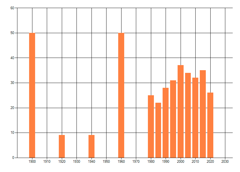 Het aantal atlasblokken (5x5 km) waarin de soort is gemeld binnen een periode van vijf jaar (vanaf 1980) of twintig jaar. Niet gecorrigeerd voor waarnemersinspanning en het aantal doorgegeven waarnemingen kan sterk variëren per periode, dus een trend in verspreiding kan hier niet direct uit worden afgelezen. Het opgegeven jaartal is het eerste jaar van de periode. Bron: gevalideerde waarnemingen uit de NDFF.