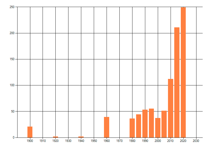 Het aantal atlasblokken (5x5 km) waarin de soort is gemeld binnen een periode van vijf jaar (vanaf 1980) of twintig jaar. Niet gecorrigeerd voor waarnemersinspanning en het aantal doorgegeven waarnemingen kan sterk variëren per periode, dus een trend in verspreiding kan hier niet direct uit worden afgelezen. Het opgegeven jaartal is het eerste jaar van de periode. Bron: gevalideerde waarnemingen uit de NDFF.
