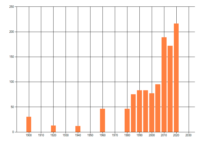 Het aantal atlasblokken (5x5 km) waarin de soort is gemeld binnen een periode van vijf jaar (vanaf 1980) of twintig jaar. Niet gecorrigeerd voor waarnemersinspanning en het aantal doorgegeven waarnemingen kan sterk variëren per periode, dus een trend in verspreiding kan hier niet direct uit worden afgelezen. Het opgegeven jaartal is het eerste jaar van de periode. Bron: gevalideerde waarnemingen uit de NDFF.