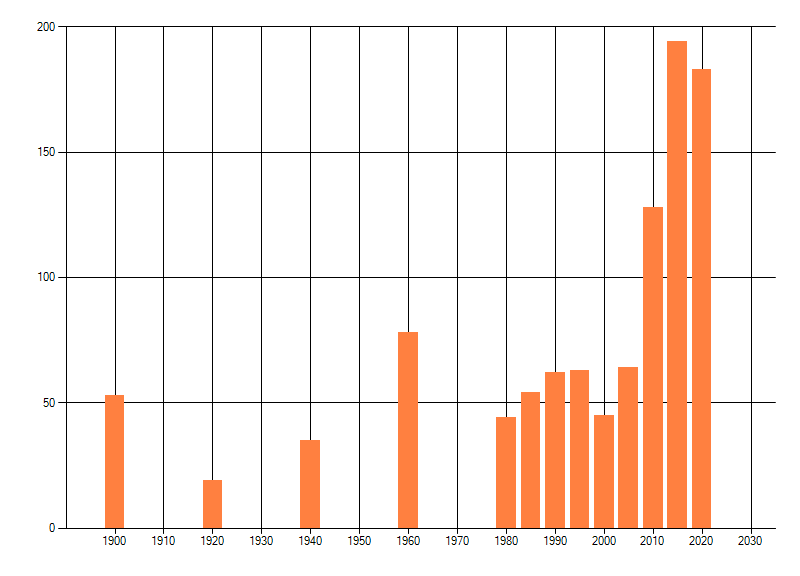Het aantal atlasblokken (5x5 km) waarin de soort is gemeld binnen een periode van vijf jaar (vanaf 1980) of twintig jaar. Niet gecorrigeerd voor waarnemersinspanning en het aantal doorgegeven waarnemingen kan sterk variëren per periode, dus een trend in verspreiding kan hier niet direct uit worden afgelezen. Het opgegeven jaartal is het eerste jaar van de periode. Bron: gevalideerde waarnemingen uit de NDFF.