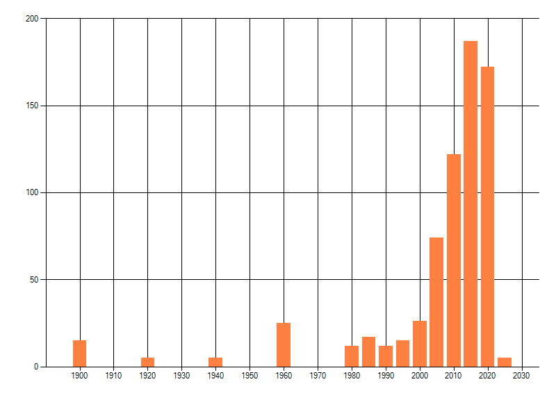 Het aantal atlasblokken (5x5 km) waarin de soort is gemeld binnen een periode van vijf jaar (vanaf 1980) of twintig jaar. Niet gecorrigeerd voor waarnemersinspanning en het aantal doorgegeven waarnemingen kan sterk variëren per periode, dus een trend in verspreiding kan hier niet direct uit worden afgelezen. Het opgegeven jaartal is het eerste jaar van de periode. Bron: gevalideerde waarnemingen uit de NDFF.