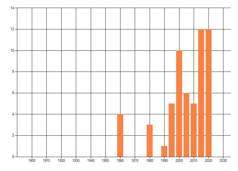 Het aantal atlasblokken (5x5 km) waarin de soort is gemeld binnen een periode van vijf jaar (vanaf 1980) of twintig jaar. Niet gecorrigeerd voor waarnemersinspanning en het aantal doorgegeven waarnemingen kan sterk variëren per periode, dus een trend in verspreiding kan hier niet direct uit worden afgelezen. Het opgegeven jaartal is het eerste jaar van de periode. Bron: gevalideerde waarnemingen uit de NDFF.