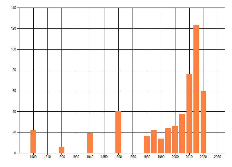 Het aantal atlasblokken (5x5 km) waarin de soort is gemeld binnen een periode van vijf jaar (vanaf 1980) of twintig jaar. Niet gecorrigeerd voor waarnemersinspanning en het aantal doorgegeven waarnemingen kan sterk variëren per periode, dus een trend in verspreiding kan hier niet direct uit worden afgelezen. Het opgegeven jaartal is het eerste jaar van de periode. Bron: gevalideerde waarnemingen uit de NDFF.