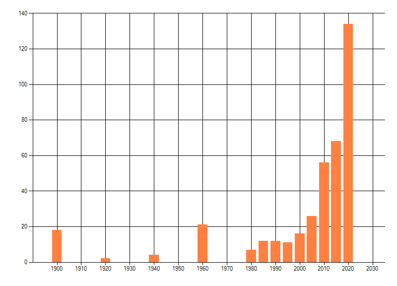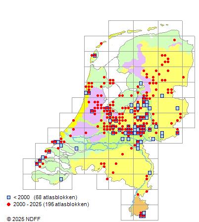 Het aantal atlasblokken (5x5 km) waarin de soort is gemeld binnen een periode van vijf jaar (vanaf 1980) of twintig jaar. Niet gecorrigeerd voor waarnemersinspanning en het aantal doorgegeven waarnemingen kan sterk variëren per periode, dus een trend in verspreiding kan hier niet direct uit worden afgelezen. Het opgegeven jaartal is het eerste jaar van de periode. Bron: gevalideerde waarnemingen uit de NDFF.