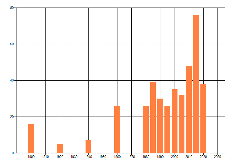 Het aantal atlasblokken (5x5 km) waarin de soort is gemeld binnen een periode van vijf jaar (vanaf 1980) of twintig jaar. Niet gecorrigeerd voor waarnemersinspanning en het aantal doorgegeven waarnemingen kan sterk variëren per periode, dus een trend in verspreiding kan hier niet direct uit worden afgelezen. Het opgegeven jaartal is het eerste jaar van de periode. Bron: gevalideerde waarnemingen uit de NDFF.