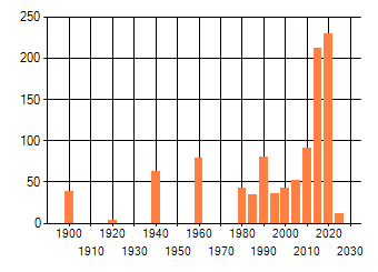 Het aantal atlasblokken (5x5 km) waarin de soort is gemeld binnen een periode van vijf jaar (vanaf 1980) of twintig jaar. Niet gecorrigeerd voor waarnemersinspanning en het aantal doorgegeven waarnemingen kan sterk variëren per periode, dus een trend in verspreiding kan hier niet direct uit worden afgelezen. Het opgegeven jaartal is het eerste jaar van de periode. Bron: gevalideerde waarnemingen uit de NDFF.