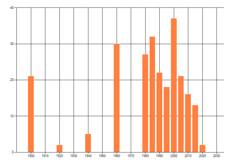 Het aantal atlasblokken (5x5 km) waarin de soort is gemeld binnen een periode van vijf jaar (vanaf 1980) of twintig jaar. Niet gecorrigeerd voor waarnemersinspanning en het aantal doorgegeven waarnemingen kan sterk variëren per periode, dus een trend in verspreiding kan hier niet direct uit worden afgelezen. Het opgegeven jaartal is het eerste jaar van de periode. Bron: gevalideerde waarnemingen uit de NDFF.