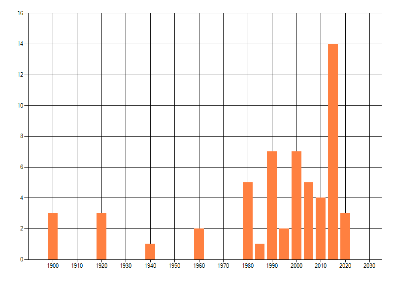 Het aantal atlasblokken (5x5 km) waarin de soort is gemeld binnen een periode van vijf jaar (vanaf 1980) of twintig jaar. Niet gecorrigeerd voor waarnemersinspanning en het aantal doorgegeven waarnemingen kan sterk variëren per periode, dus een trend in verspreiding kan hier niet direct uit worden afgelezen. Het opgegeven jaartal is het eerste jaar van de periode. Bron: gevalideerde waarnemingen uit de NDFF.