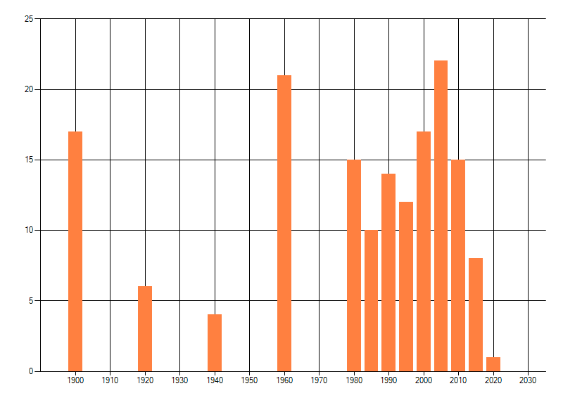 Het aantal atlasblokken (5x5 km) waarin de soort is gemeld binnen een periode van vijf jaar (vanaf 1980) of twintig jaar. Niet gecorrigeerd voor waarnemersinspanning en het aantal doorgegeven waarnemingen kan sterk variëren per periode, dus een trend in verspreiding kan hier niet direct uit worden afgelezen. Het opgegeven jaartal is het eerste jaar van de periode. Bron: gevalideerde waarnemingen uit de NDFF.