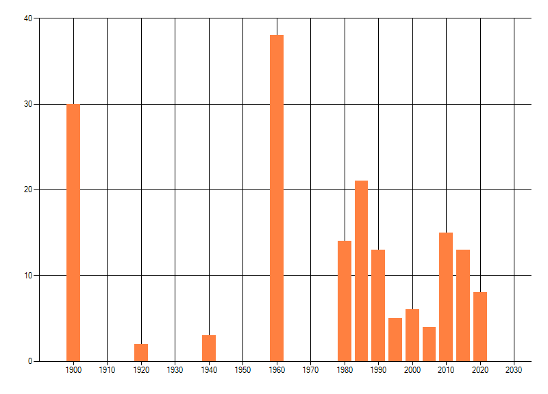 Het aantal atlasblokken (5x5 km) waarin de soort is gemeld binnen een periode van vijf jaar (vanaf 1980) of twintig jaar. Niet gecorrigeerd voor waarnemersinspanning en het aantal doorgegeven waarnemingen kan sterk variëren per periode, dus een trend in verspreiding kan hier niet direct uit worden afgelezen. Het opgegeven jaartal is het eerste jaar van de periode. Bron: gevalideerde waarnemingen uit de NDFF.
