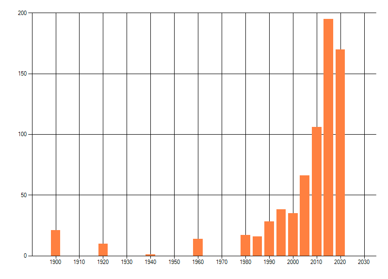 Het aantal atlasblokken (5x5 km) waarin de soort is gemeld binnen een periode van vijf jaar (vanaf 1980) of twintig jaar. Niet gecorrigeerd voor waarnemersinspanning en het aantal doorgegeven waarnemingen kan sterk variëren per periode, dus een trend in verspreiding kan hier niet direct uit worden afgelezen. Het opgegeven jaartal is het eerste jaar van de periode. Bron: gevalideerde waarnemingen uit de NDFF.