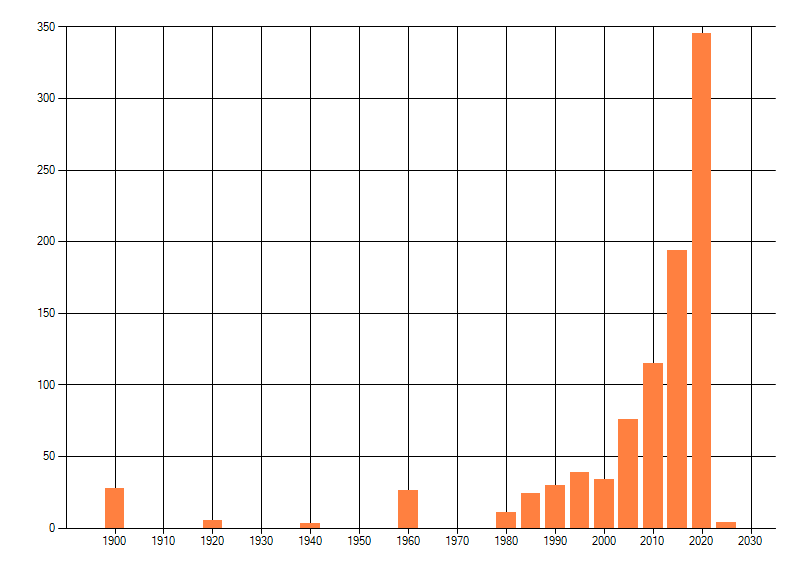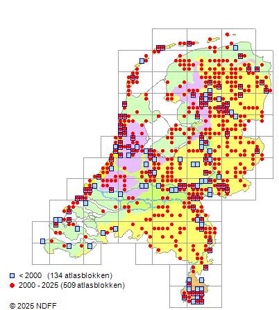 Het aantal atlasblokken (5x5 km) waarin de soort is gemeld binnen een periode van vijf jaar (vanaf 1980) of twintig jaar. Niet gecorrigeerd voor waarnemersinspanning en het aantal doorgegeven waarnemingen kan sterk variëren per periode, dus een trend in verspreiding kan hier niet direct uit worden afgelezen. Het opgegeven jaartal is het eerste jaar van de periode. Bron: gevalideerde waarnemingen uit de NDFF.