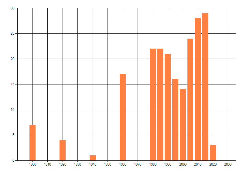 Het aantal atlasblokken (5x5 km) waarin de soort is gemeld binnen een periode van vijf jaar (vanaf 1980) of twintig jaar. Niet gecorrigeerd voor waarnemersinspanning en het aantal doorgegeven waarnemingen kan sterk variëren per periode, dus een trend in verspreiding kan hier niet direct uit worden afgelezen. Het opgegeven jaartal is het eerste jaar van de periode. Bron: gevalideerde waarnemingen uit de NDFF.