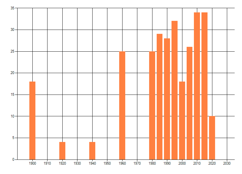 Het aantal atlasblokken (5x5 km) waarin de soort is gemeld binnen een periode van vijf jaar (vanaf 1980) of twintig jaar. Niet gecorrigeerd voor waarnemersinspanning en het aantal doorgegeven waarnemingen kan sterk variëren per periode, dus een trend in verspreiding kan hier niet direct uit worden afgelezen. Het opgegeven jaartal is het eerste jaar van de periode. Bron: gevalideerde waarnemingen uit de NDFF.