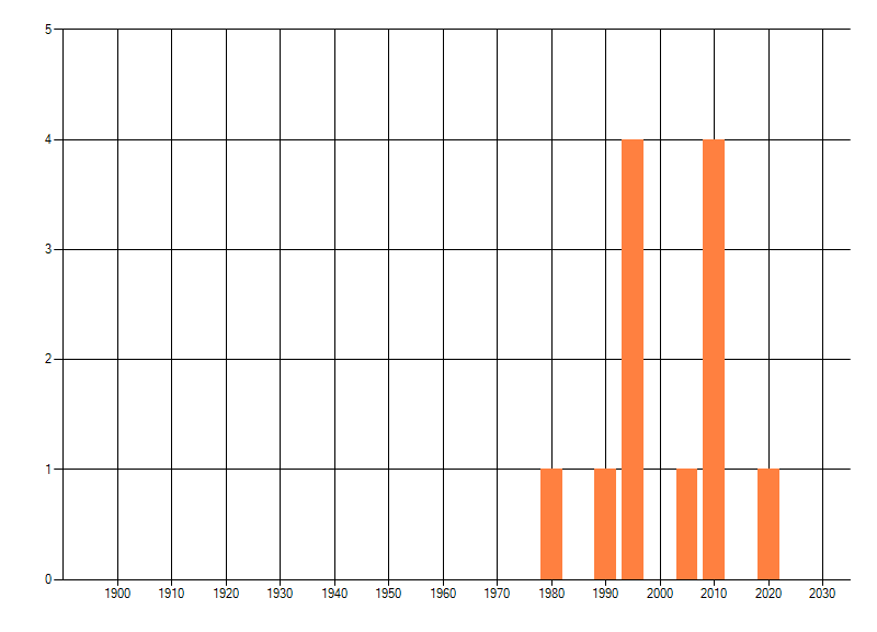 Het aantal atlasblokken (5x5 km) waarin de soort is gemeld binnen een periode van vijf jaar (vanaf 1980) of twintig jaar. Niet gecorrigeerd voor waarnemersinspanning en het aantal doorgegeven waarnemingen kan sterk variëren per periode, dus een trend in verspreiding kan hier niet direct uit worden afgelezen. Het opgegeven jaartal is het eerste jaar van de periode. Bron: gevalideerde waarnemingen uit de NDFF.