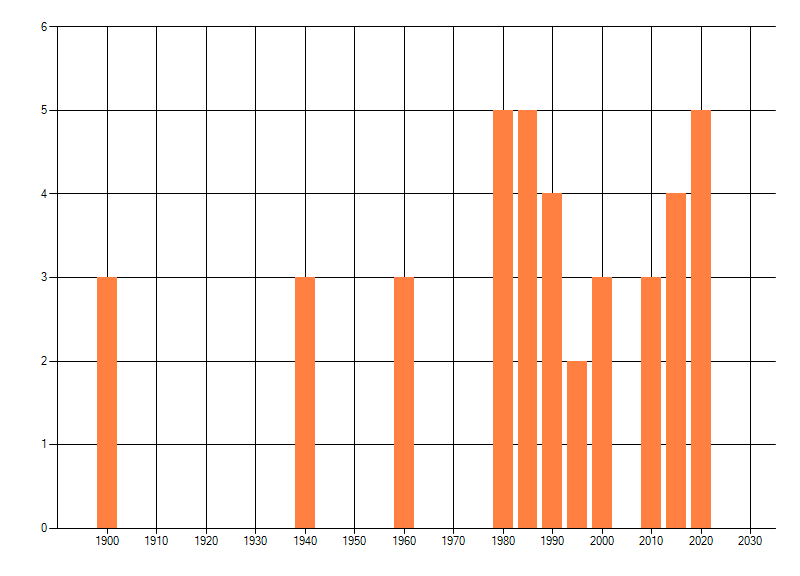 Het aantal atlasblokken (5x5 km) waarin de soort is gemeld binnen een periode van vijf jaar (vanaf 1980) of twintig jaar. Niet gecorrigeerd voor waarnemersinspanning en het aantal doorgegeven waarnemingen kan sterk variëren per periode, dus een trend in verspreiding kan hier niet direct uit worden afgelezen. Het opgegeven jaartal is het eerste jaar van de periode. Bron: gevalideerde waarnemingen uit de NDFF.