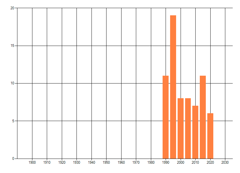 Het aantal atlasblokken (5x5 km) waarin de soort is gemeld binnen een periode van vijf jaar (vanaf 1980) of twintig jaar. Niet gecorrigeerd voor waarnemersinspanning en het aantal doorgegeven waarnemingen kan sterk variëren per periode, dus een trend in verspreiding kan hier niet direct uit worden afgelezen. Het opgegeven jaartal is het eerste jaar van de periode. Bron: gevalideerde waarnemingen uit de NDFF.