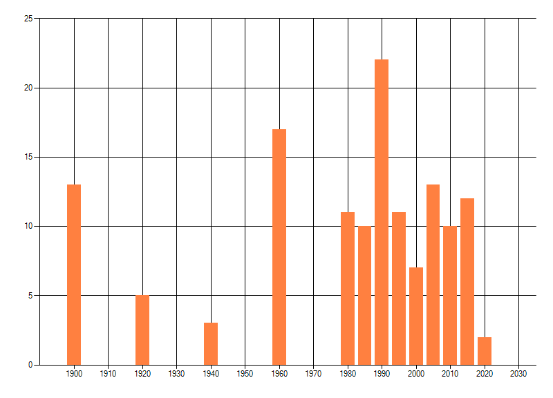 Het aantal atlasblokken (5x5 km) waarin de soort is gemeld binnen een periode van vijf jaar (vanaf 1980) of twintig jaar. Niet gecorrigeerd voor waarnemersinspanning en het aantal doorgegeven waarnemingen kan sterk variëren per periode, dus een trend in verspreiding kan hier niet direct uit worden afgelezen. Het opgegeven jaartal is het eerste jaar van de periode. Bron: gevalideerde waarnemingen uit de NDFF.