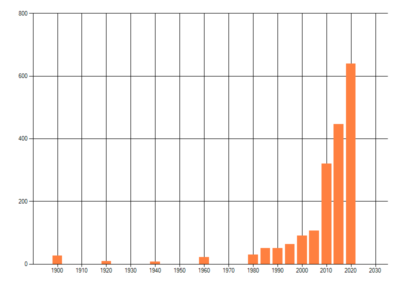 Het aantal atlasblokken (5x5 km) waarin de soort is gemeld binnen een periode van vijf jaar (vanaf 1980) of twintig jaar. Niet gecorrigeerd voor waarnemersinspanning en het aantal doorgegeven waarnemingen kan sterk variëren per periode, dus een trend in verspreiding kan hier niet direct uit worden afgelezen. Het opgegeven jaartal is het eerste jaar van de periode. Bron: gevalideerde waarnemingen uit de NDFF.