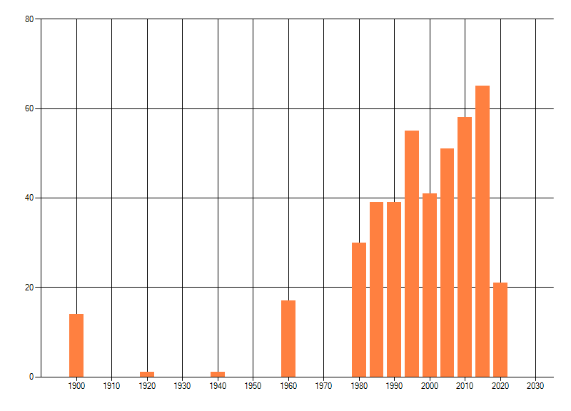 Het aantal atlasblokken (5x5 km) waarin de soort is gemeld binnen een periode van vijf jaar (vanaf 1980) of twintig jaar. Niet gecorrigeerd voor waarnemersinspanning en het aantal doorgegeven waarnemingen kan sterk variëren per periode, dus een trend in verspreiding kan hier niet direct uit worden afgelezen. Het opgegeven jaartal is het eerste jaar van de periode. Bron: gevalideerde waarnemingen uit de NDFF.