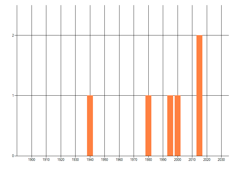Het aantal atlasblokken (5x5 km) waarin de soort is gemeld binnen een periode van vijf jaar (vanaf 1980) of twintig jaar. Niet gecorrigeerd voor waarnemersinspanning en het aantal doorgegeven waarnemingen kan sterk variëren per periode, dus een trend in verspreiding kan hier niet direct uit worden afgelezen. Het opgegeven jaartal is het eerste jaar van de periode. Bron: gevalideerde waarnemingen uit de NDFF.