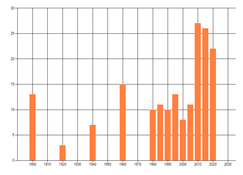 Het aantal atlasblokken (5x5 km) waarin de soort is gemeld binnen een periode van vijf jaar (vanaf 1980) of twintig jaar. Niet gecorrigeerd voor waarnemersinspanning en het aantal doorgegeven waarnemingen kan sterk variëren per periode, dus een trend in verspreiding kan hier niet direct uit worden afgelezen. Het opgegeven jaartal is het eerste jaar van de periode. Bron: gevalideerde waarnemingen uit de NDFF.