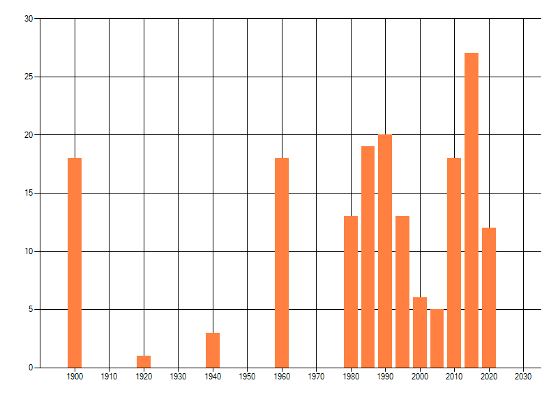 Het aantal atlasblokken (5x5 km) waarin de soort is gemeld binnen een periode van vijf jaar (vanaf 1980) of twintig jaar. Niet gecorrigeerd voor waarnemersinspanning en het aantal doorgegeven waarnemingen kan sterk variëren per periode, dus een trend in verspreiding kan hier niet direct uit worden afgelezen. Het opgegeven jaartal is het eerste jaar van de periode. Bron: gevalideerde waarnemingen uit de NDFF.
