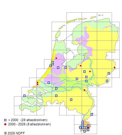 Het aantal atlasblokken (5x5 km) waarin de soort is gemeld binnen een periode van vijf jaar (vanaf 1980) of twintig jaar. Niet gecorrigeerd voor waarnemersinspanning en het aantal doorgegeven waarnemingen kan sterk variëren per periode, dus een trend in verspreiding kan hier niet direct uit worden afgelezen. Het opgegeven jaartal is het eerste jaar van de periode. Bron: gevalideerde waarnemingen uit de NDFF.
