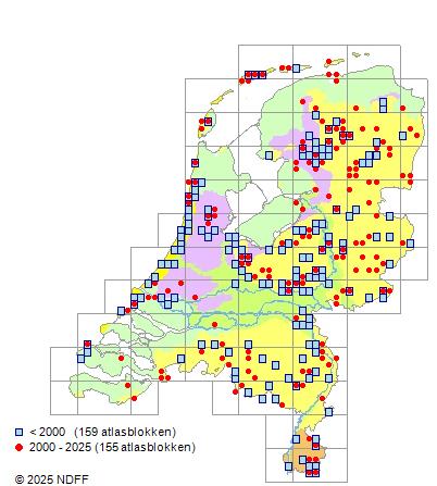 Het aantal atlasblokken (5x5 km) waarin de soort is gemeld binnen een periode van vijf jaar (vanaf 1980) of twintig jaar. Niet gecorrigeerd voor waarnemersinspanning en het aantal doorgegeven waarnemingen kan sterk variëren per periode, dus een trend in verspreiding kan hier niet direct uit worden afgelezen. Het opgegeven jaartal is het eerste jaar van de periode. Bron: gevalideerde waarnemingen uit de NDFF.