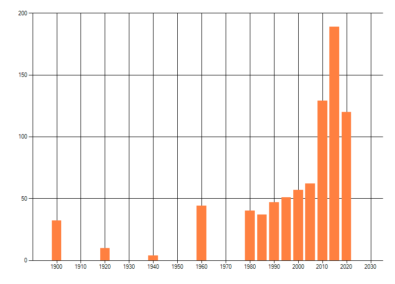 Het aantal atlasblokken (5x5 km) waarin de soort is gemeld binnen een periode van vijf jaar (vanaf 1980) of twintig jaar. Niet gecorrigeerd voor waarnemersinspanning en het aantal doorgegeven waarnemingen kan sterk variëren per periode, dus een trend in verspreiding kan hier niet direct uit worden afgelezen. Het opgegeven jaartal is het eerste jaar van de periode. Bron: gevalideerde waarnemingen uit de NDFF.