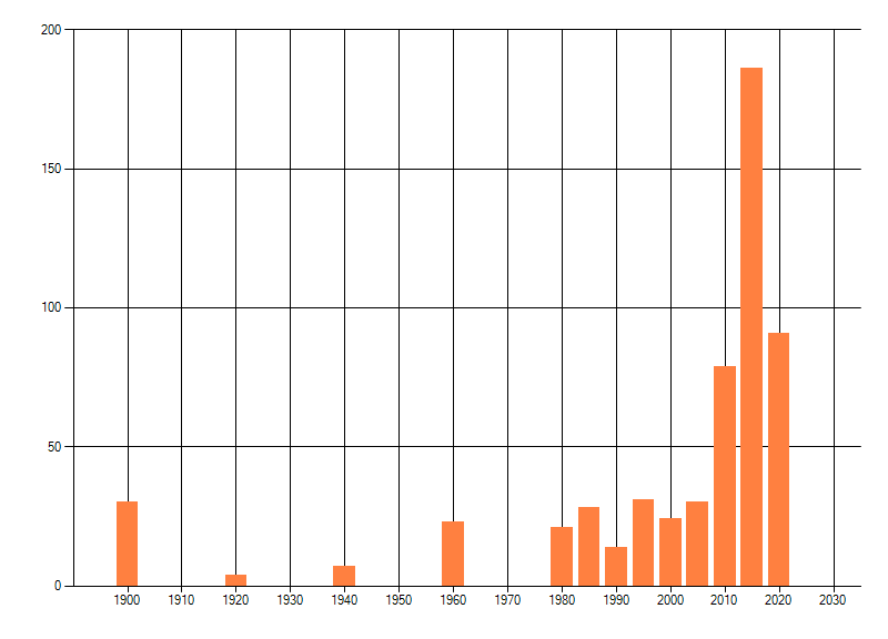Het aantal atlasblokken (5x5 km) waarin de soort is gemeld binnen een periode van vijf jaar (vanaf 1980) of twintig jaar. Niet gecorrigeerd voor waarnemersinspanning en het aantal doorgegeven waarnemingen kan sterk variëren per periode, dus een trend in verspreiding kan hier niet direct uit worden afgelezen. Het opgegeven jaartal is het eerste jaar van de periode. Bron: gevalideerde waarnemingen uit de NDFF.