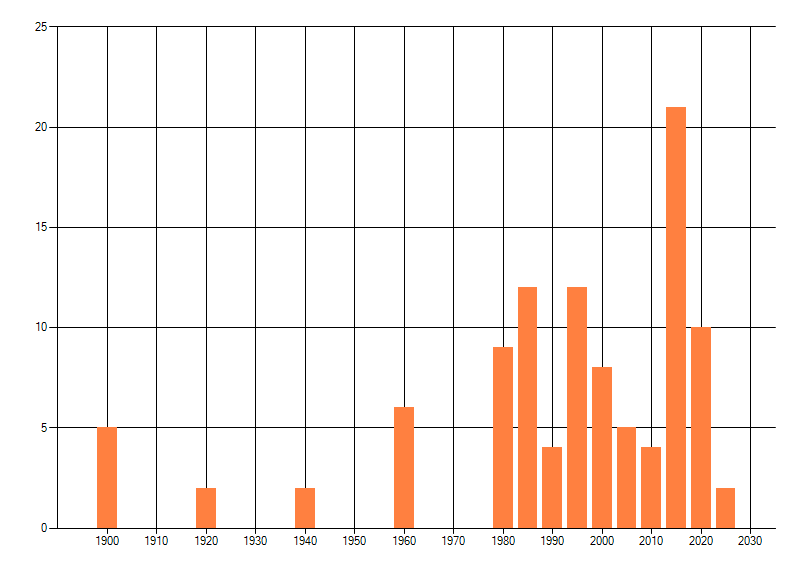 Het aantal atlasblokken (5x5 km) waarin de soort is gemeld binnen een periode van vijf jaar (vanaf 1980) of twintig jaar. Niet gecorrigeerd voor waarnemersinspanning en het aantal doorgegeven waarnemingen kan sterk variëren per periode, dus een trend in verspreiding kan hier niet direct uit worden afgelezen. Het opgegeven jaartal is het eerste jaar van de periode. Bron: gevalideerde waarnemingen uit de NDFF.