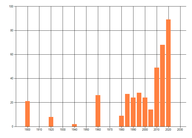 Het aantal atlasblokken (5x5 km) waarin de soort is gemeld binnen een periode van vijf jaar (vanaf 1980) of twintig jaar. Niet gecorrigeerd voor waarnemersinspanning en het aantal doorgegeven waarnemingen kan sterk variëren per periode, dus een trend in verspreiding kan hier niet direct uit worden afgelezen. Het opgegeven jaartal is het eerste jaar van de periode. Bron: gevalideerde waarnemingen uit de NDFF.