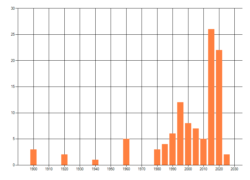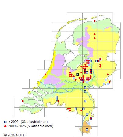 Het aantal atlasblokken (5x5 km) waarin de soort is gemeld binnen een periode van vijf jaar (vanaf 1980) of twintig jaar. Niet gecorrigeerd voor waarnemersinspanning en het aantal doorgegeven waarnemingen kan sterk variëren per periode, dus een trend in verspreiding kan hier niet direct uit worden afgelezen. Het opgegeven jaartal is het eerste jaar van de periode. Bron: gevalideerde waarnemingen uit de NDFF.