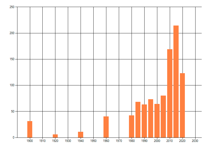 Het aantal atlasblokken (5x5 km) waarin de soort is gemeld binnen een periode van vijf jaar (vanaf 1980) of twintig jaar. Niet gecorrigeerd voor waarnemersinspanning en het aantal doorgegeven waarnemingen kan sterk variëren per periode, dus een trend in verspreiding kan hier niet direct uit worden afgelezen. Het opgegeven jaartal is het eerste jaar van de periode. Bron: gevalideerde waarnemingen uit de NDFF.