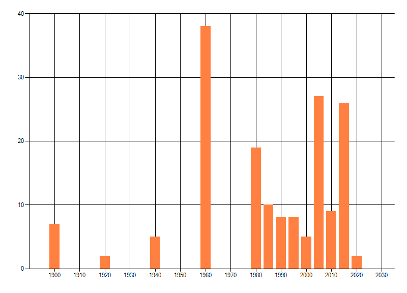 Het aantal atlasblokken (5x5 km) waarin de soort is gemeld binnen een periode van vijf jaar (vanaf 1980) of twintig jaar. Niet gecorrigeerd voor waarnemersinspanning en het aantal doorgegeven waarnemingen kan sterk variëren per periode, dus een trend in verspreiding kan hier niet direct uit worden afgelezen. Het opgegeven jaartal is het eerste jaar van de periode. Bron: gevalideerde waarnemingen uit de NDFF.
