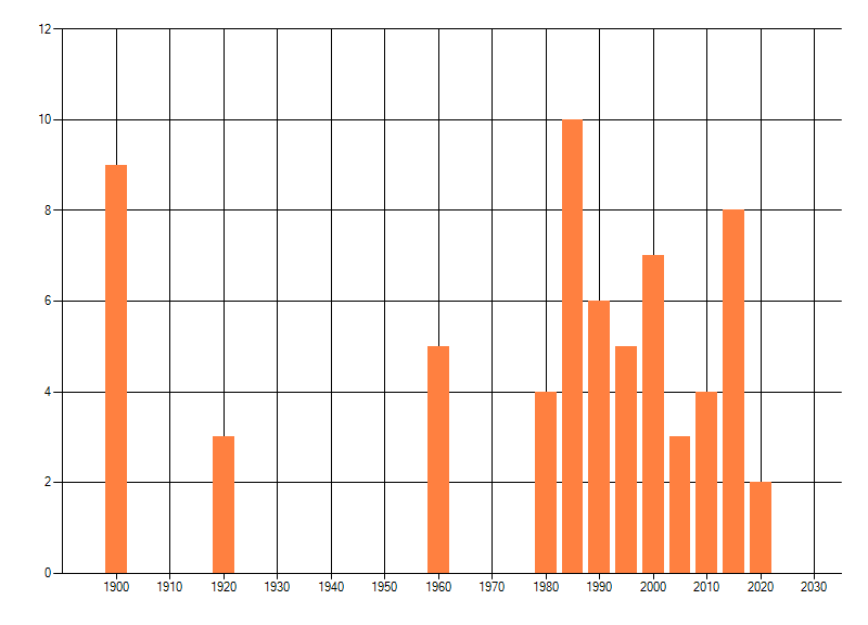 Het aantal atlasblokken (5x5 km) waarin de soort is gemeld binnen een periode van vijf jaar (vanaf 1980) of twintig jaar. Niet gecorrigeerd voor waarnemersinspanning en het aantal doorgegeven waarnemingen kan sterk variëren per periode, dus een trend in verspreiding kan hier niet direct uit worden afgelezen. Het opgegeven jaartal is het eerste jaar van de periode. Bron: gevalideerde waarnemingen uit de NDFF.