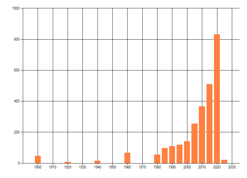 Het aantal atlasblokken (5x5 km) waarin de soort is gemeld binnen een periode van vijf jaar (vanaf 1980) of twintig jaar. Niet gecorrigeerd voor waarnemersinspanning en het aantal doorgegeven waarnemingen kan sterk variëren per periode, dus een trend in verspreiding kan hier niet direct uit worden afgelezen. Het opgegeven jaartal is het eerste jaar van de periode. Bron: gevalideerde waarnemingen uit de NDFF.