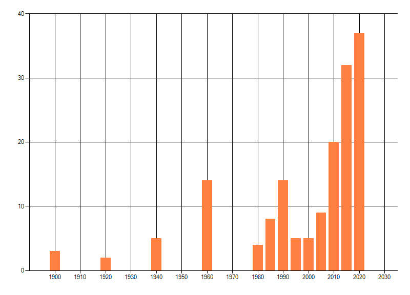 Het aantal atlasblokken (5x5 km) waarin de soort is gemeld binnen een periode van vijf jaar (vanaf 1980) of twintig jaar. Niet gecorrigeerd voor waarnemersinspanning en het aantal doorgegeven waarnemingen kan sterk variëren per periode, dus een trend in verspreiding kan hier niet direct uit worden afgelezen. Het opgegeven jaartal is het eerste jaar van de periode. Bron: gevalideerde waarnemingen uit de NDFF.